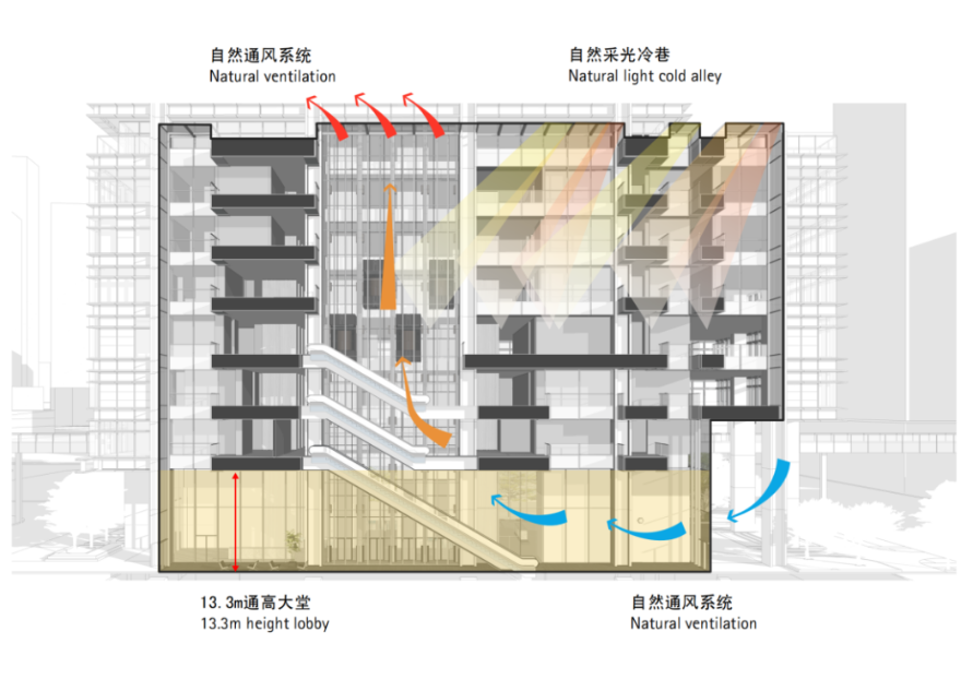 在建筑本体节能方面,设置太阳能烟囱、冷巷,最大限度地利用自然通风,同时因地制宜规划布局,利用高性能围护结构、自然采光、遮阳等被动式技术,营造健康室内环境,最大程度降低建筑用能需求。在主动能效提升方面,采用高效制冷机房、新风全热回收、高效智能照明系统、高效电梯等措施,最大程度降低能源消耗。在可再生能源方面,在塔楼屋顶、幕墙横向装饰翼以及裙楼屋顶创新性应用建筑光伏发电系统,年发电量约65万度,年减碳量可达350吨。在运行调节与管理方面,搭建智慧物联网系统,实现智慧管理平台可视化、能源系统AI优化控制,高效开展能源管理数据统计分析和预测工作。在碳清除和碳抵消方面,采用多种形式景观,充分利用绿化碳汇碳清除效果,运行阶段采用绿色电力证书交易的形式,抵消大楼运行阶段剩余碳排放,交易期间实现楼宇运行阶段净零碳排放。