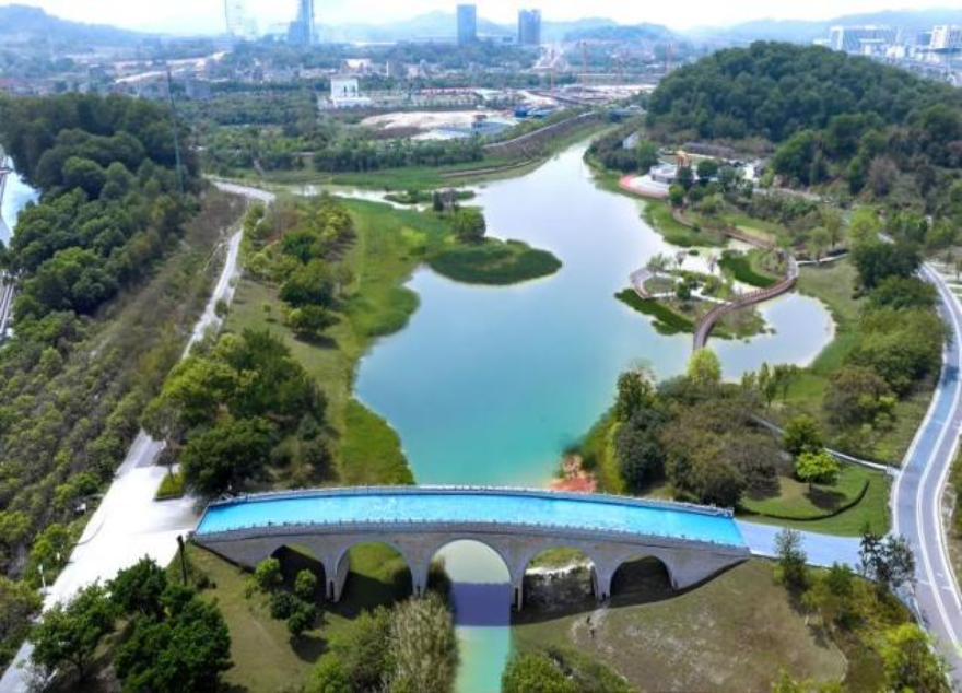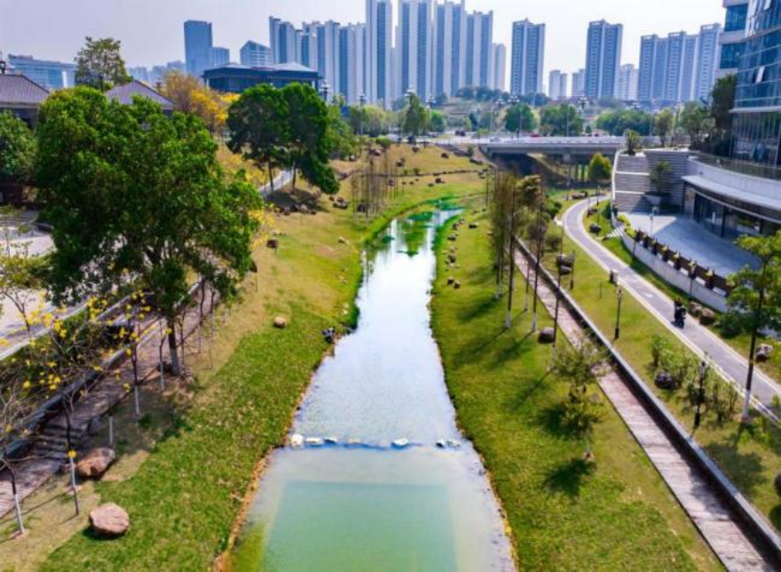 凤凰河发源于帽峰山东麓,其治理核心在于源头拦污、生态修复与河道活化。通过在关键节点设置“雨水花园”、截污口拦截以及沉水植物还原等系统性治理方式,凤凰河从此前的“片段治理”升级为贯穿式生态长廊。如今,水质清澈见底,两岸绿植环绕,形成了湿地生态与亲水空间的自然融合。