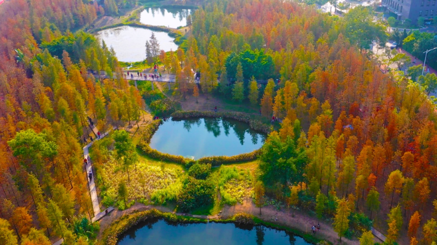 46.8公顷的湿地生态系统中,135种鸟类繁衍生息,白鹭在浅滩跳起芭蕾,翠鸟如蓝色闪电划过水面,夜鹭在落羽杉林间编织着黄昏的诗行。特别设计的观鸟屋和声纹识别系统,让市民得以零距离观察这些“湿地精灵”。芦苇、香蒲等38种水生植物构建起立体的生态矩阵,随着季节更迭变幻着不同的妆容:春日芦苇抽新绿,夏日荷花映日红,秋日荻花飞白雪,冬日落羽杉披上浓郁的美拉德色系外衣。全运会期间,这里将化身“生态会客厅”,向世界展示中国湿地保护成果。