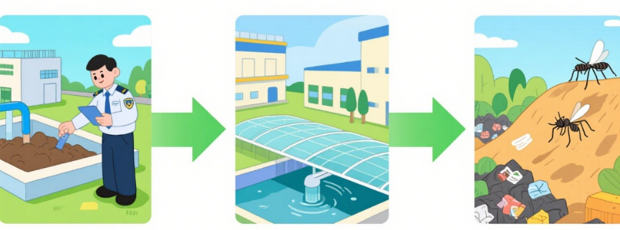 3.企业污水处理池:企业对露天污水处理池加盖封闭或安装防蚊网;定期清理池壁污垢和底部淤泥(蚊卵易附着区域);检查处理池周边排水系统,确保尾水排放后无积水滞留。