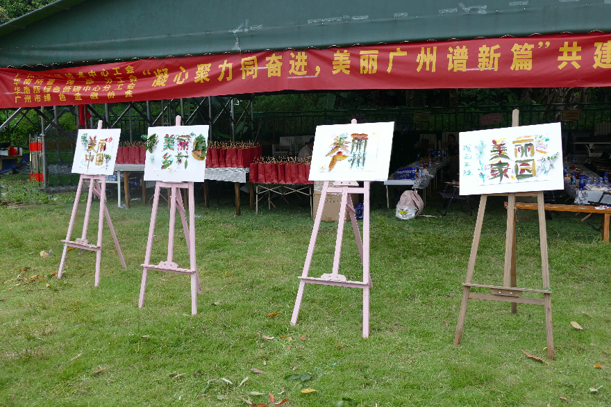 全体成员分组利用徒步途中收集的落叶、花瓣开展环保拼画创作。各小组分别围绕“美丽中国、美丽广州、美丽乡村、美丽家园”主题展开构思设计,通过密切的团队协作,一幅幅构思巧妙、寓意深远的艺术作品逐一呈现。创意拼画既彰显了对自然之美的敬畏与热爱,更传递出共建人与自然和谐共生的现代化美好愿景。