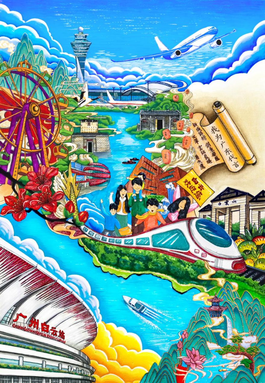 蒙建桦同学的海报创意与画面表现力拉满!以明快绚丽的色彩为底,巧妙融合高铁、飞机等现代交通地标,串联起摩天轮、古建筑、山水盛景,木棉盛放、白鹤翱翔于河畔,还有一家人乘高铁时的欢乐互动,搭配 “我为广东代言” 的卷轴与 “白云欢迎您” 的标牌……全方位尽显美丽广州的独特魅力。