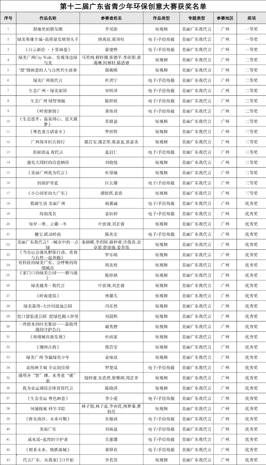 近日,第十二届广东省青少年环保创意大赛获奖名单正式揭晓!作为全省青少年环保创意的 “竞技场”,本届大赛征集参赛作品6000余件,共诞生 140 件优秀获奖作品,其中广州市斩获 43 个奖项,占全省获奖总数近三成,用创意与实力交出了一份亮眼的 “绿色答卷”,充分展现了广州青少年对生态环保的深刻思考与担当。