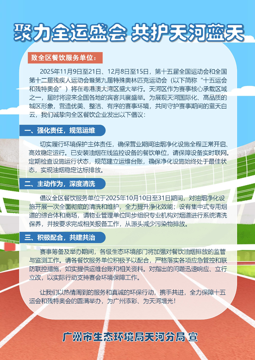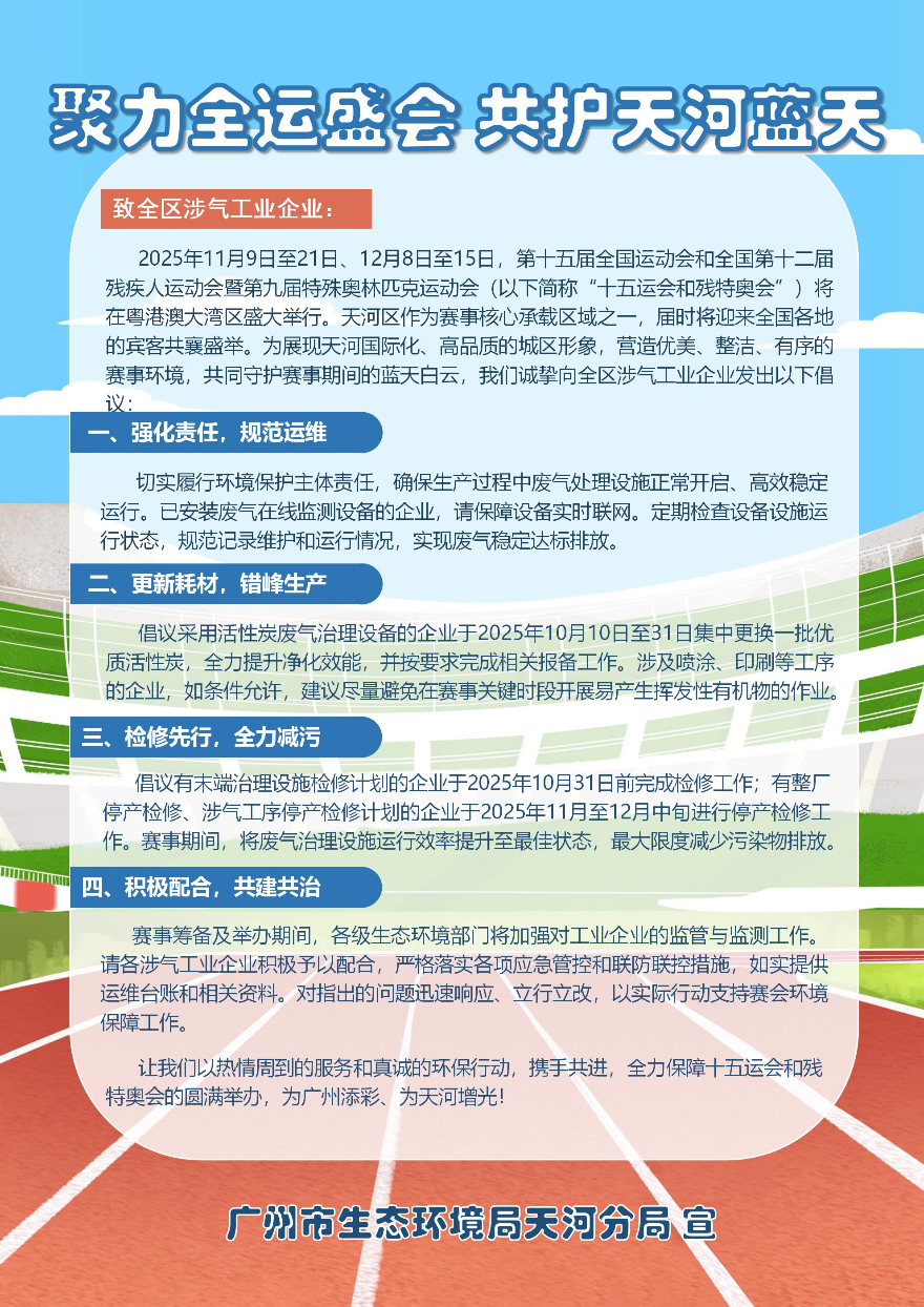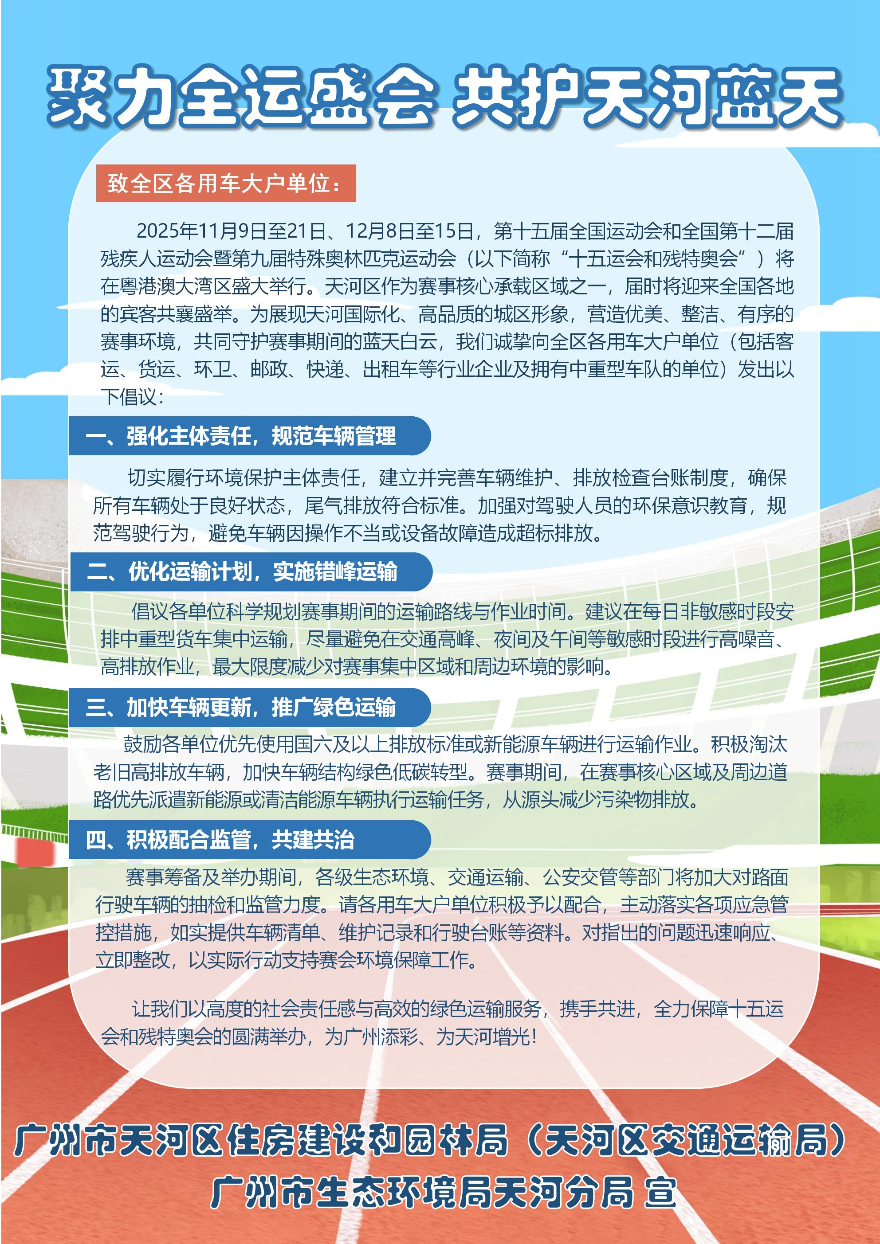 近日,为全力保障十五运会和残特奥会期间的环境空气质量,广州市生态环境局天河分局、天河区住房建设和园林局(区交通运输局)、天河区城市管理和综合执法局针对与空气质量息息相关的五类重点对象,共同发出《聚力全运盛会 共护天河蓝天》系列倡议书,变“监管”为“共治”,化“要求”为“邀请”。