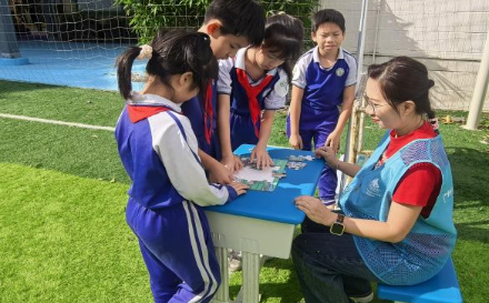 西关外国语流花学校同学在尝试碳足迹游戏 环市西路小学同学在完成环保拼图