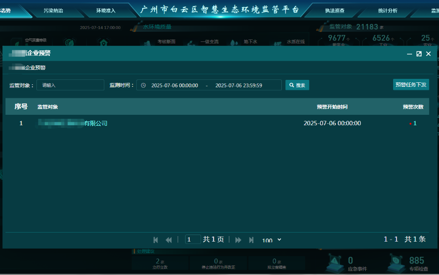 白云分局依托“白云区智慧生态监管平台”,综合运用在线监控、无人机、走航监测、视频监控等动态信息,结合环评审批、排污许可、自主验收等静态信息进行多维度分析,构建“环境质量预警—污染源筛查—监管联动”响应模型。平台运行以来,已指导2960家企业处理异常信息超4.6万条次。