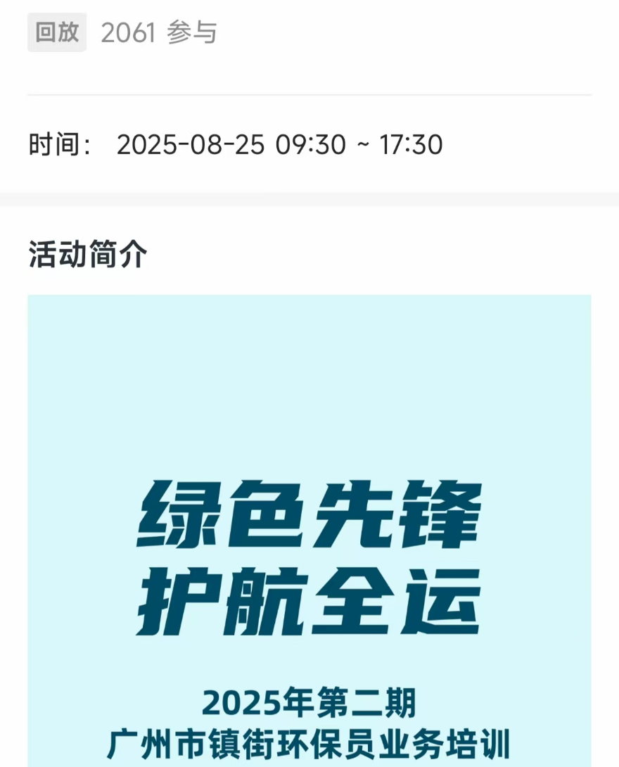 为进一步增强全市环保工作者生态环境素养和环保工作能力,助力打造美丽全运,建设美丽中国城市样板,广州市生态环境局于8月18日与8月25日,通过“线下实训+线上巩固”形式举办“绿色先锋 护航全运”2025年第二期广州市镇街环保员业务培训。全市各镇街环保员代表2100余人次参加。