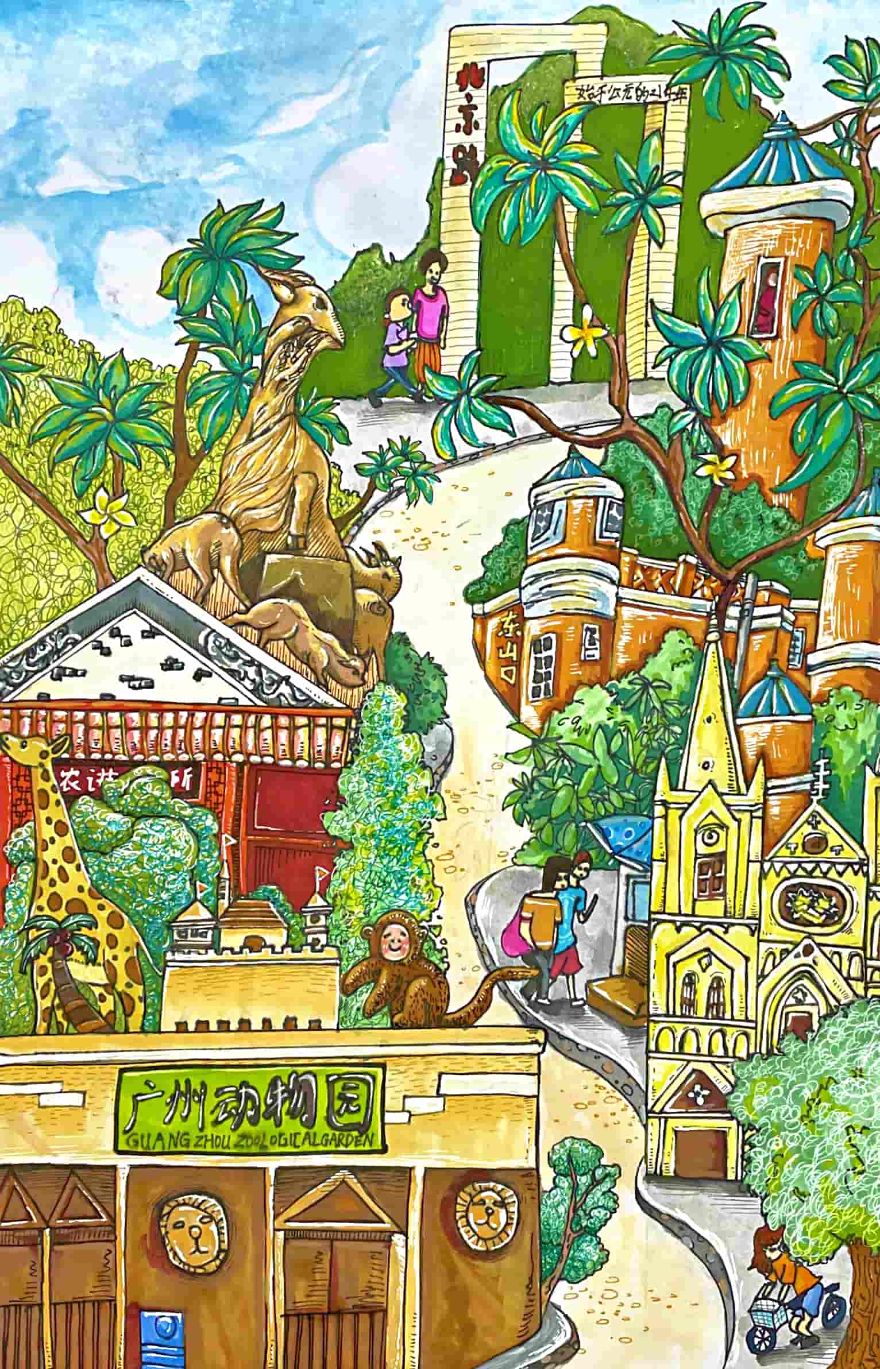 创作感想:本作品旨在表达越秀区“山水入城、城在画中” 的风韵。作品主题涵盖了“广州动物园”“农讲所”“圣心大教堂”“东山口和北京路”街景等元素,融合了城市的生态,体现了城市肌理与自然风光的和谐共生。