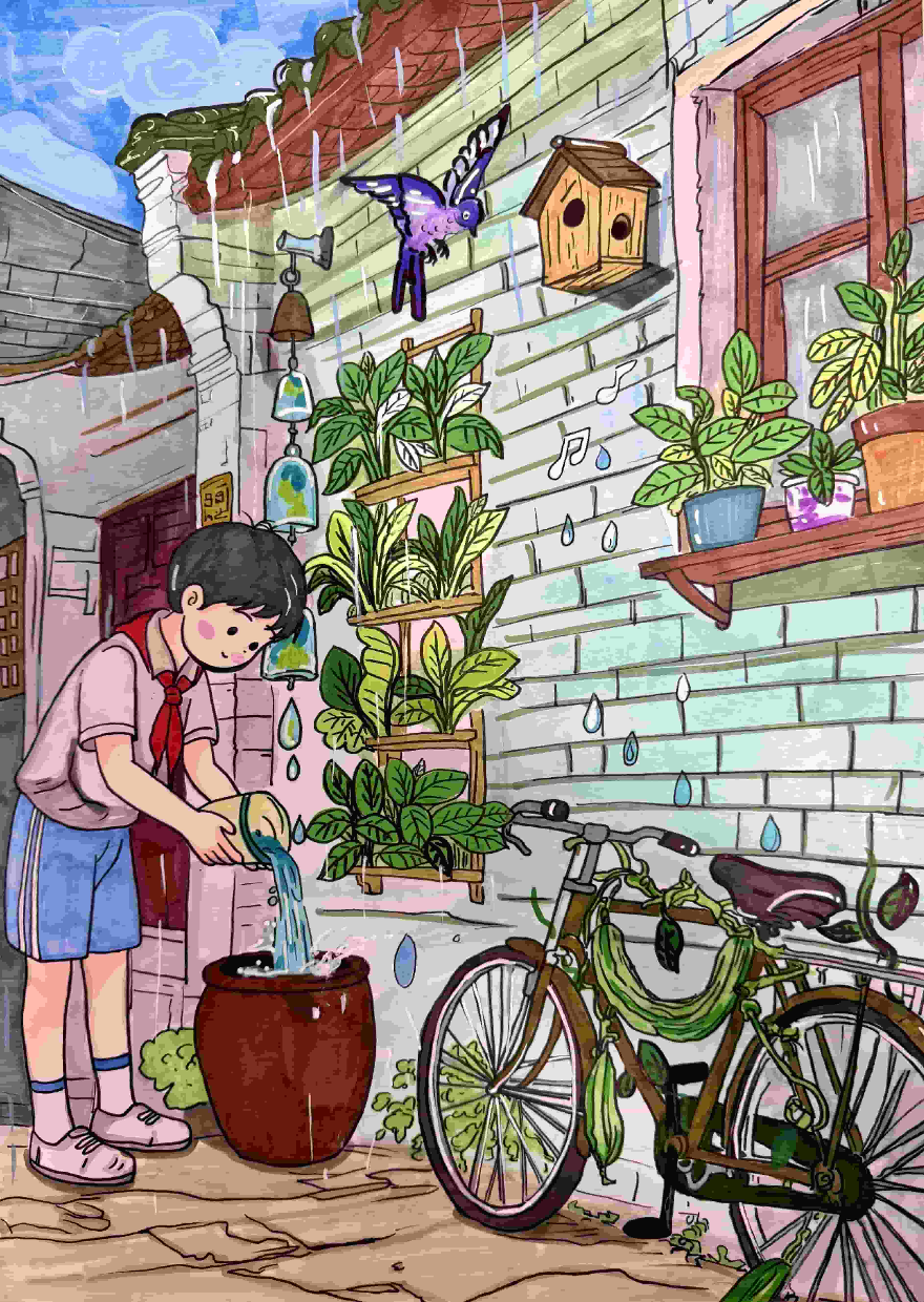 创作感想:雨落北京路骑楼,青砖墙淌水,窗阳台绿化,居民浇花、自行车缠绿蔓,旧物活用,低碳日常晕织岭南街巷的环保诗意。