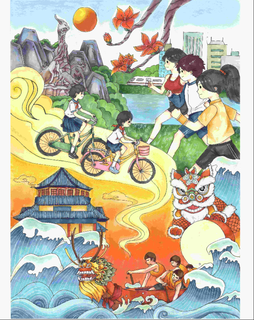 创作感想:五羊静立越秀山间,市花木棉悄然绽放。云腾里单车碾过绿意,江畔奔跑拂过龙舟,醒狮鼓应和地铁轻响,环保呼吸漫越城楼与山河,感受生活的便利。