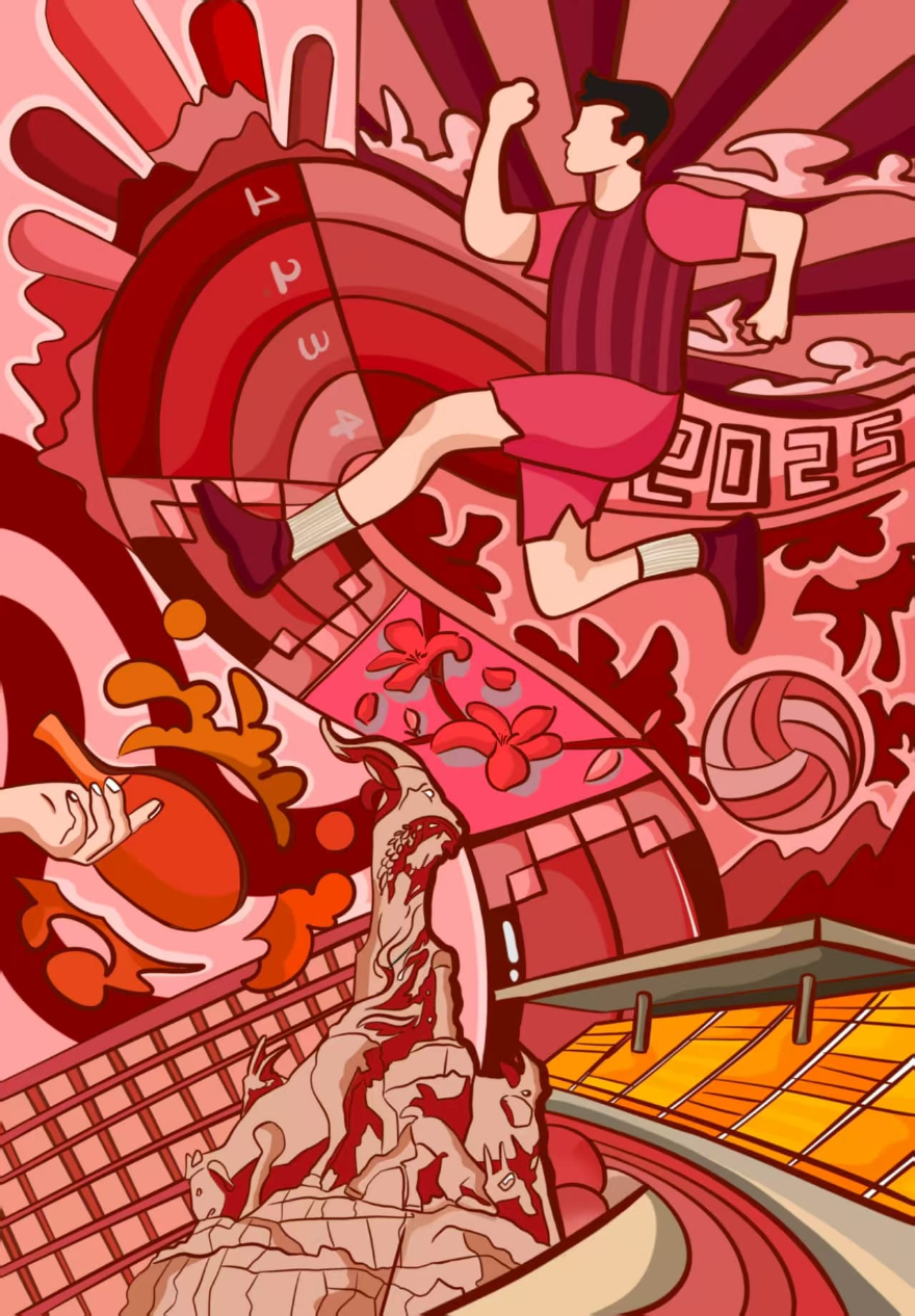 创作感想:以广州木棉红为视觉基调,融合岭南文化元素,诠释全运热情与岭南活力。红云跃动,寓意体育精神如火焰不息!