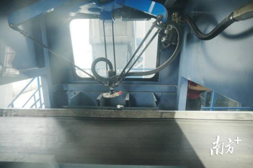 在白云区嘉禾街新科垃圾压缩站,机械臂在灵活地运转,经过AI智能分拣,牛奶盒、餐盒等可回收物品从生活垃圾中被一一分拣出来,随着传输带分门别类掉进篮框中。这是在全国范围内,首次将AI智能分选技术运用在生活垃圾分拣中,使垃圾减量率达到40%以上,减少了后端焚烧处理的负担。