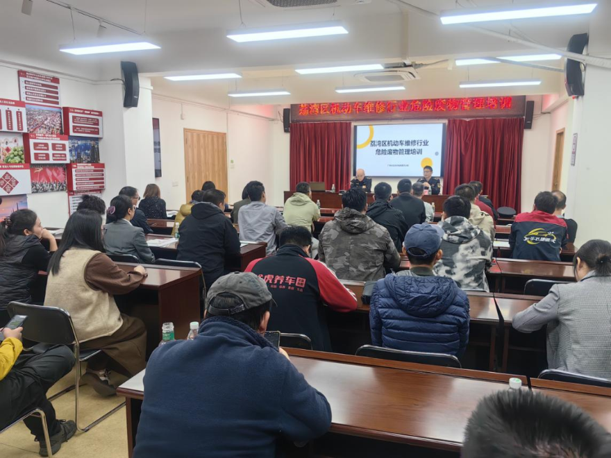 三、服务先行,筑牢管理新基础。强化监管的同时,荔湾分局加强教育引导,联合区交通运输局分片区组织3场专题培训,基本实现对辖区两百余家汽修企业的全覆盖。培训通过剖析央视、广东卫视曝光的违法案例,以案说法,让企业“红脸出汗”的同时,深刻认识合法经营和规范管理的严肃性与重要性,有效压实企业环保主体责任。现场设置互动答疑和实操演示,帮助企业“听得懂、学得会、用得好”,系统掌握危废识别、申报、贮存等全链条合规要求。