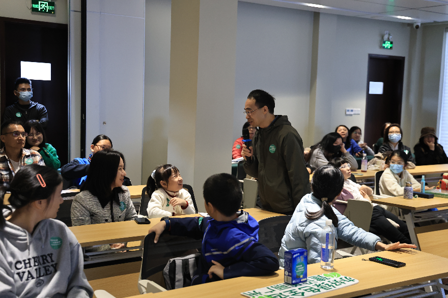 环保知识问答环节将课堂气氛推向高潮。家长与孩子们踊跃参与,争相作答:“我国力争在2030年前实现碳达峰、2060年前实现碳中和目标。”“新能源包括风能、光能、氢能……”问答之间,绿色发展的理念悄然浸润心田。