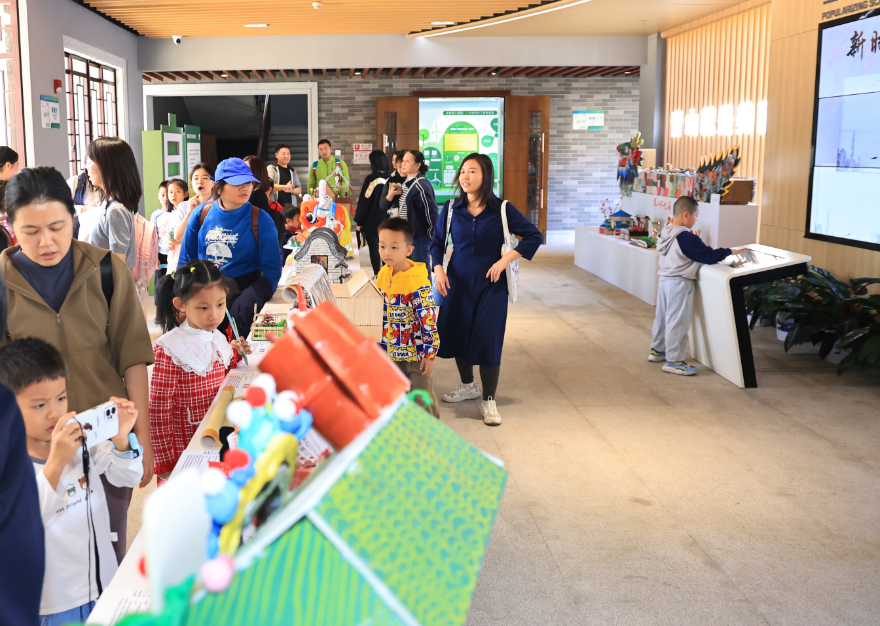 随后,队伍来到位于广州水博苑一楼的广州新时代生态文明建设主题馆。在宣教中心讲解员的带领下,市民逐步走进一个更具纵深感的生态展示空间。从“绿色全运”的低碳场馆改造,到“美丽单元”的创新投融资模式;从空气质量持续改善,到生物多样性系统保护——主题馆以生态之美、环境之美、城市之美、创新之美、产业之美、美丽细胞、美丽全运、风尚之美这“广州八美”为主线,通过图文展板、环幕投影、沙盘模型和实物互动等多种形式,系统展示广州贯彻落实习近平生态文明思想、推进美丽广州建设的最新实践与成效。丰富的展示内容激发了市民深入了解的兴趣。在互动体验区,不少市民主动在“广州碳普惠合伙人”互动装置处驻足合影,扫码参加线上碳普惠合伙人打卡,以实际行动响应绿色倡议,表达对生态环境保护的支持。
