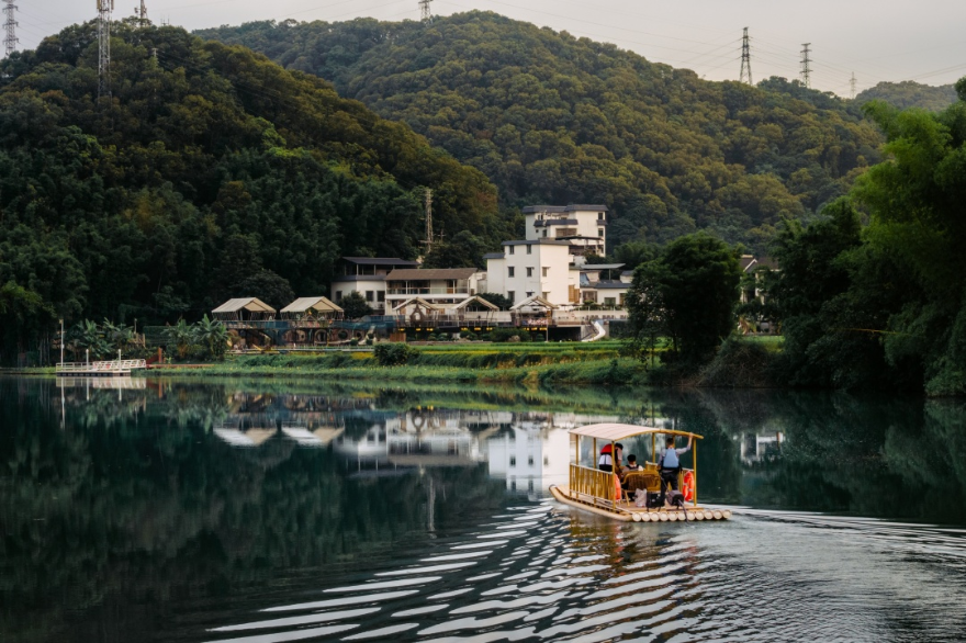 流溪河畔,游客乘着竹筏经过米埗村。