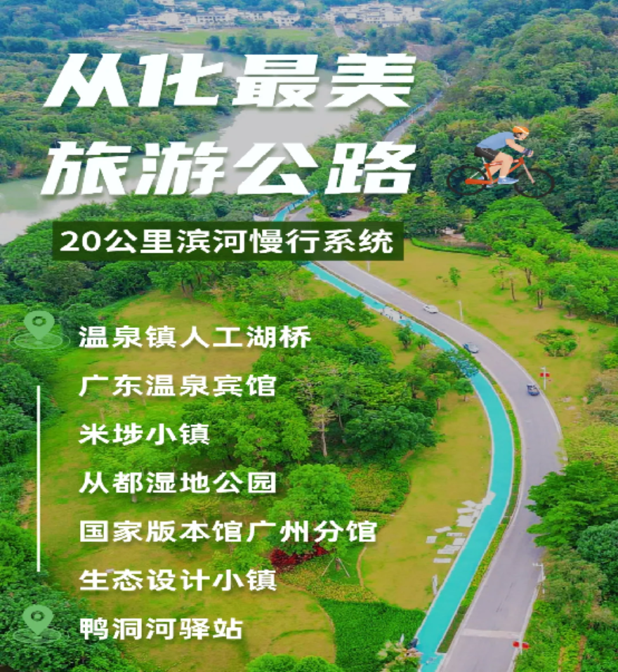 这条总长20公里的滨河绿道,以温泉镇人工湖桥为起点,深度串联广东温泉宾馆、从都湿地公园、国家版本馆广州分馆、生态设计小镇等核心节点,形成一条沉浸式风景廊道,真正实现“人在景中游”。