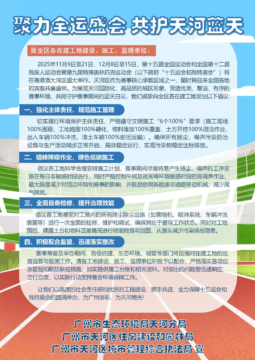近日,为全力保障十五运会和残特奥会期间的环境空气质量,广州市生态环境局天河分局、天河区住房建设和园林局(区交通运输局)、天河区城市管理和综合执法局针对与空气质量息息相关的五类重点对象,共同发出《聚力全运盛会 共护天河蓝天》系列倡议书,变“监管”为“共治”,化“要求”为“邀请”。