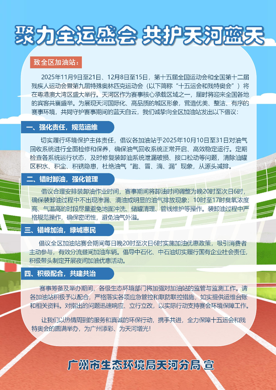 致加油站的“蓝天续航员”,呼吁赛会期间将卸油作业安排在晚8点至次日凌晨6点,并鼓励车主夜间加油,共同减少油气挥发,守护赛会期间清新空气。