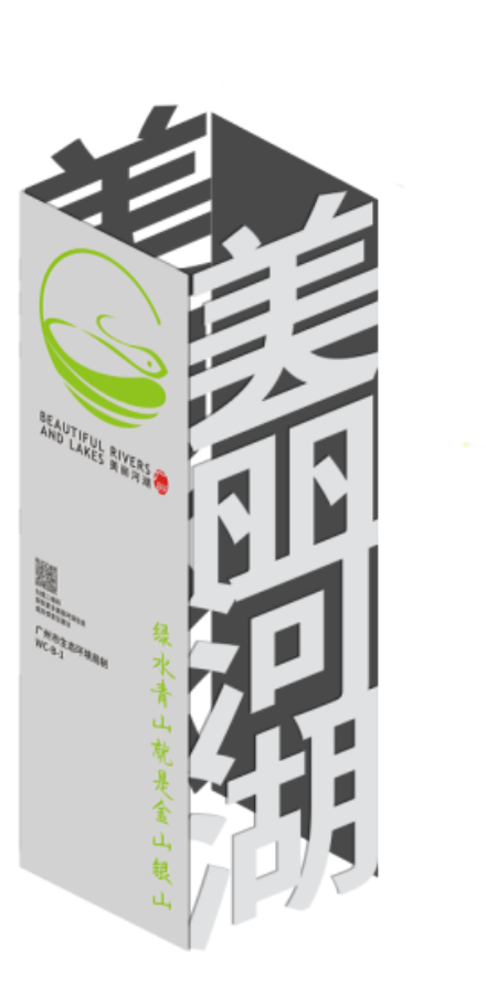 设计以“低干扰、高融合”为原则,打造与河湖生态共生的视觉语言:镜面不锈钢底座借反射“消隐”于环境,营造“翠色悬浮”的轻盈感;上部选用生态翠绿,呼应“清水绿岸”;极简矩形体块暗藏生态符号,以人工秩序与自然光影的互动,诠释“理性设计共生自然”的逻辑。