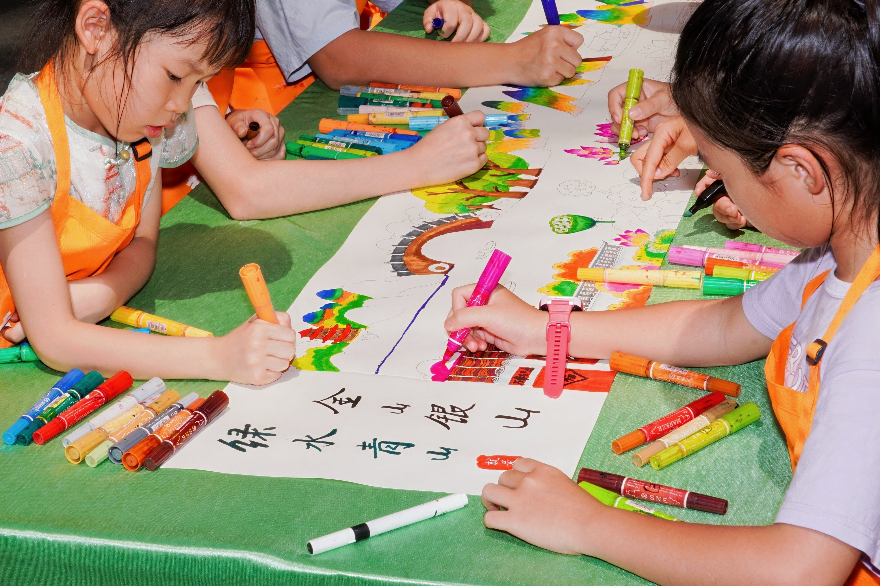 活动现场,小朋友们围绕7米长画卷进行主题创作,用稚嫩的画笔描绘心中的"绿水青山就是金山银山"。孩子们在专业艺术教师指导下,将从化温泉、流溪河、石门森林公园等生态美景跃然纸上,用童真的视角诠释着生态文明理念。长画卷作品集中展现了从化区优美的自然风光和深厚的生态底蕴,体现了生态文明教育从娃娃抓起的重要意义。