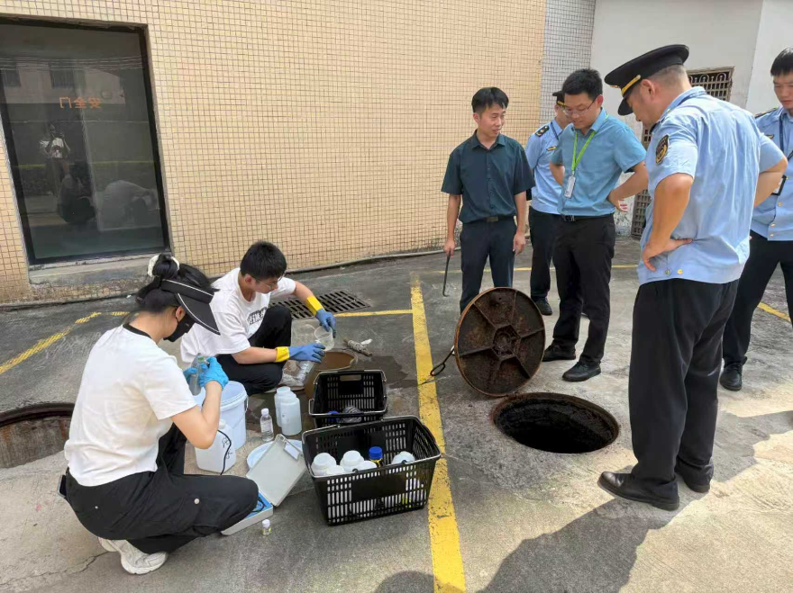 图2:荔湾分局执法人员开展整改核验,委托荔湾环境监测站开展废水监测