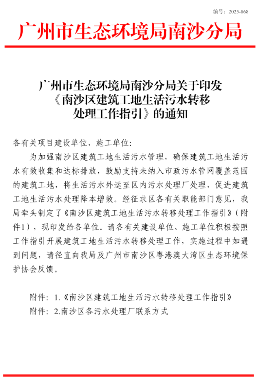 针对辖区建筑工地数量多、单独配套生活污水处理设施建设和运行成本高,以及日常监管中发现部分工地的生活污水处理设施难以正常运行、污水不能稳定达标排放等问题,近日广州市生态环境局南沙分局牵头制定了《南沙区建筑工地生活污水转移处理工作指引》,鼓励支持未纳入市政污水管网覆盖范围的建筑工地将生活污水外运至区内污水处理厂处理,促进建筑工地生活污水处理降本增效,解决工地生活污水治理出路问题。