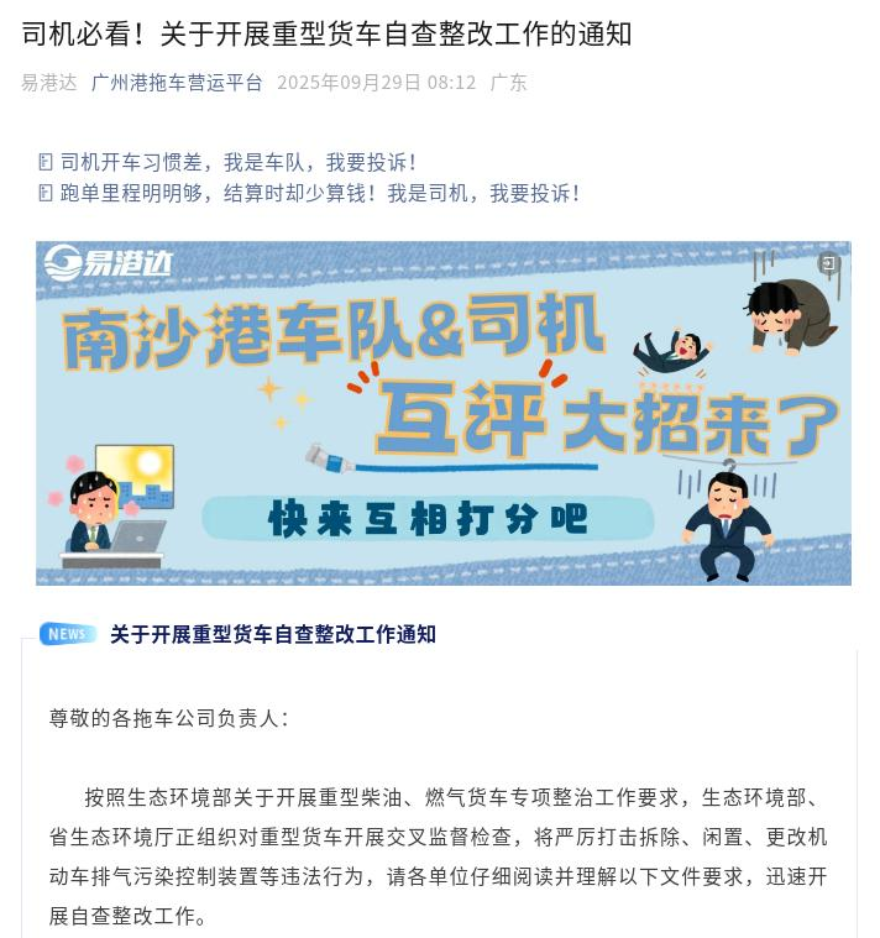 2025年9月,广州市生态环境局南沙分局委托广州港拖车运营中心在公众号平台发布《关于开展重型车自查整改工作的通知》(以下简称《通知》)(https://mp.weixin.qq.com/s/6tfax5uo0Mi8FG--iu-A_w),并通过平台内部邮件将《通知》发送至各相关拖车公司。