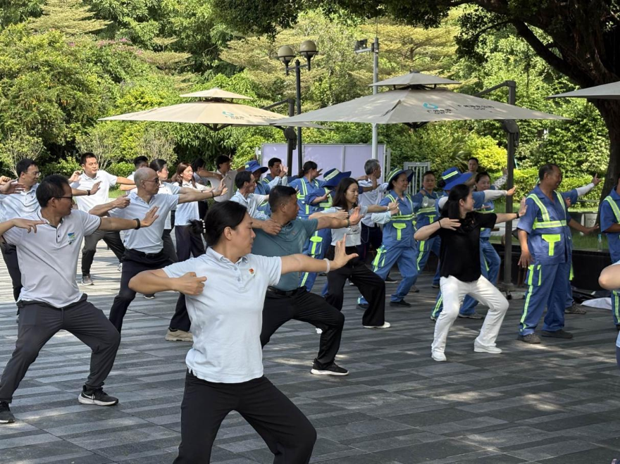 活动在一场行云流水、刚柔并济的八段锦表演中正式拉开序幕。广州市净水有限公司猎德分公司职工化身专业“健身导师”,带领市民们学习体验这一传统养生方法。从“双手托天理三焦”的舒展大气,到“背后七颠百病消”的灵动轻盈,大家在柔和缓慢的一招一式与深长均匀的一呼一吸间,切身感受传统养生智慧与自然环境的和谐共鸣。这一环节将弘扬传统养生文化与倡导绿色健康生活方式相结合,为活动注入了独特的活力与内涵。