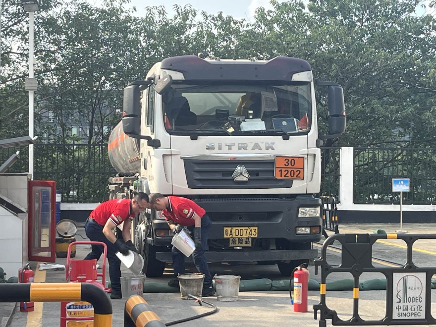 本次演练模拟新塘水库加油站卸油作业期间,因管线接驳口松脱导致大量柴油泄漏,部分柴油流入连通新塘水库的加油站雨水井,引发水体污染风险。事故发生后,加油站立即启动应急预案,对事故区地面柴油进行围堵,并同步向天河区消防救援大队和广州市生态环境局天河分局通报事故情况。