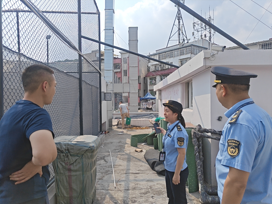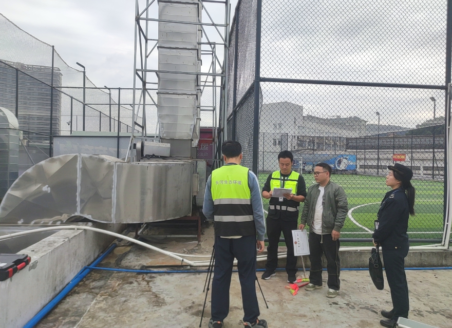 此前,市民信访反馈:“市场设备的噪声天天不停,晚上想早睡、白天想安静都难!”执法人员赶赴现场发现,该美食市场内商户密集,各类风机、油烟设备多且分布集中,噪声源头难以快速分辨。为精准找到“症结”,执法人员会同街道环保中队逐一对市场内商户的设备运行状态、排烟管道走向展开细致核查,尤其重点关注靠近居民楼的设施。最终发现,离居民区最近的一根排烟管,正是某涉事商户楼顶平台风机的配套管道,监测显示昼间噪声达63dB(A),超出《社会生活环境噪声排放标准》限值。