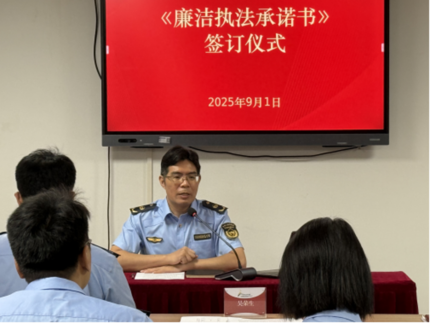 《工作规范》对执法人员行为规范和廉洁自律提出明确要求,创新引入《规范涉企检查廉洁执法承诺书》(以下简称《廉洁执法承诺书》)制度,从遵守纪律、改进作风、廉洁执法、杜绝违法等方面作出刚性约束。严格落实中央八项规定精神,对执法过程中出现的玩忽职守、徇私舞弊、不文明执法等行为,一律依规依纪严肃追责,确保执法权力在阳光下运行。2025年9月1日,越秀分局组织全体执法人员开展《工作规范》专题宣贯培训,分局主要领导带头签订廉洁执法承诺书,以实际行动发出“从我做起、向我看齐”的强烈信号,充分展现越秀分局规范执法、廉洁从政的坚定决心。