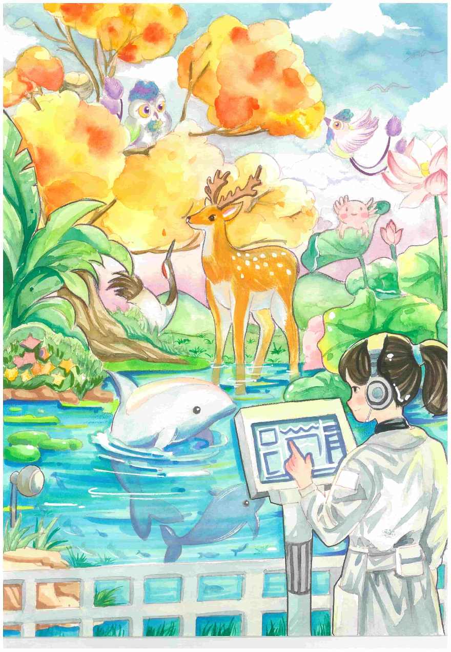 创作感想:作品以保育员聚焦东山湖中的透明生态培育舱,观察各类濒危物种保育过程为主,全息投影中显示种群基因图谱。背景为珠江湿地,佩戴追踪器的放归个体与仿生无人机巡护系统协同互动,科技赋能而构建的“越秀区公园城市”成为濒危物种的"生命方舟"。