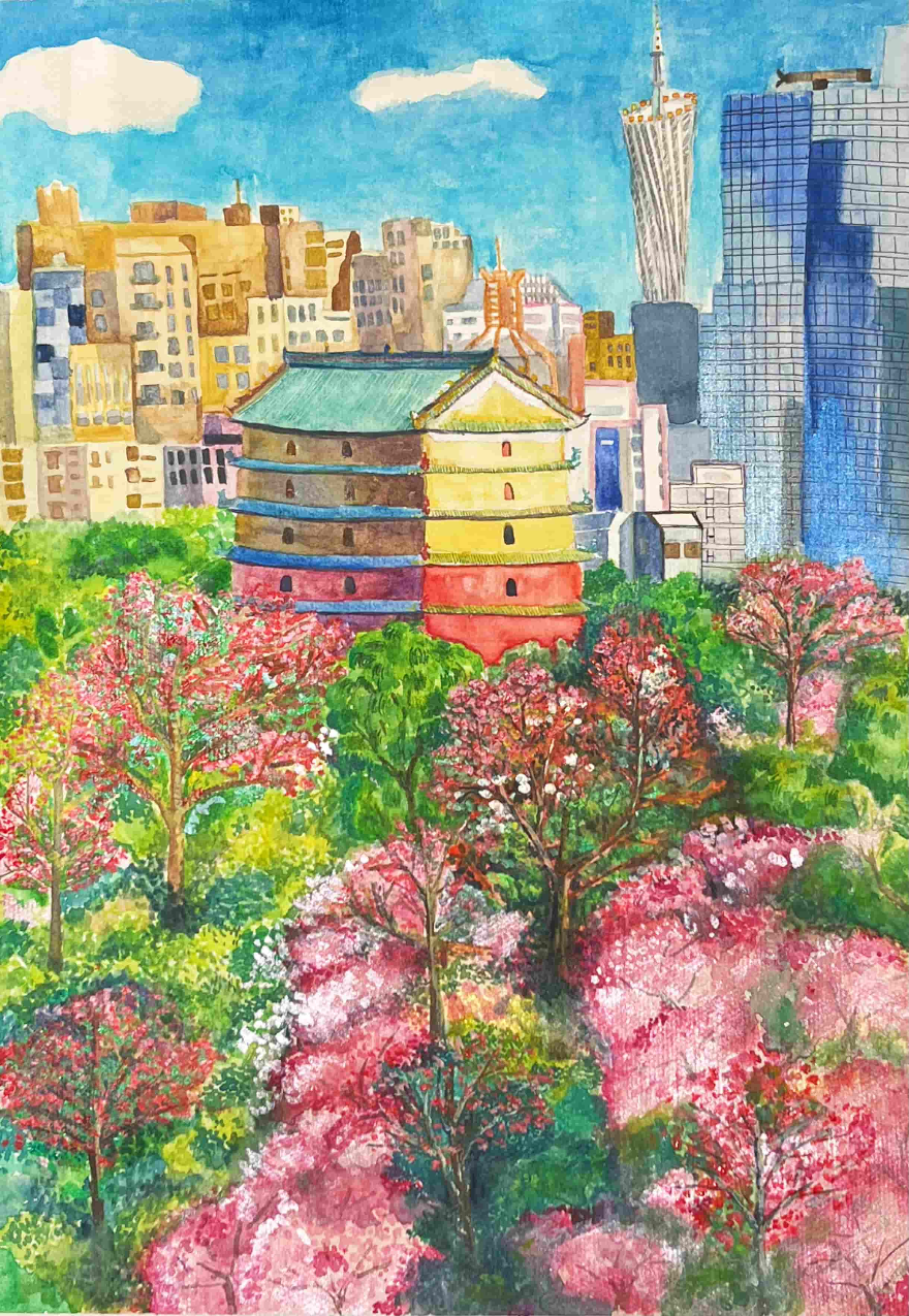 创作感想:越秀山古楼的历史底蕴、繁花的自然诗意与新厦的现代蓬勃,展现广州古今交织、和谐共美的独特气质。
