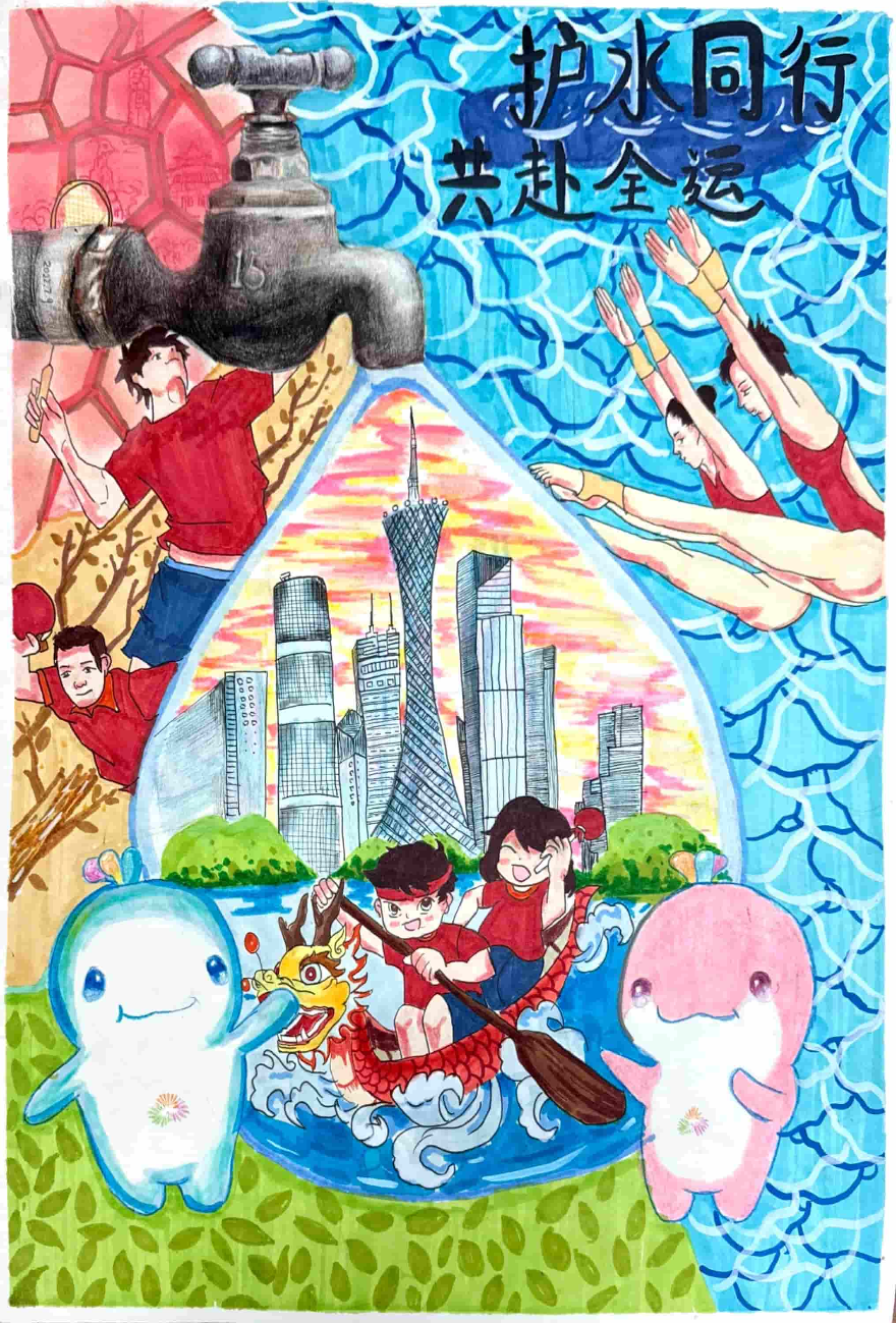 创作感想:画面以水龙头水滴为核心视觉元素,融入广州地标建筑和乒乓球、跳水、龙舟等运动,还有全运会卡通形象,传达出保护水资源与城市发展、全运盛会紧密相连。