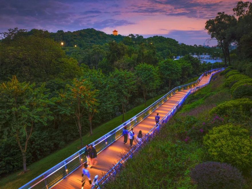 三是打造友好乐园,激活亲水体验。面对湖岸可达性差、互动体验单一、生态教育功能薄弱等问题,麓湖公园秉持“人民公园人民建”的理念,打造高密度城市中心全龄友好型亲水乐园。一方面构建3.5公里闭合环湖碧道,新建900米碧道并设置10余处亲水平台、100余块科普标识,展示动植物标本、水体生态、水鸟科普等内容,提升游客体验。另一方面推动景观提升,打造春花秋色的季相景观带,新建“云道”空中生态廊道,融合生态技术与慢行功能,优化便民设施,并开放大草坪供市民露营,重构“山-湖-城”联动景观。通过“一环+三核+多点”的立体景观网络,成功融入老城市,焕发生态新活力。