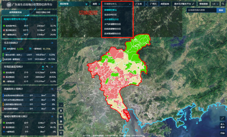 点击“广东省”页签右侧的下拉菜单选择“广州市”,在广州市地图上查看环境管控单元分布,通过切换图层查看水环境、大气环境、自然资源、近岸海域等不同管控分区分布。