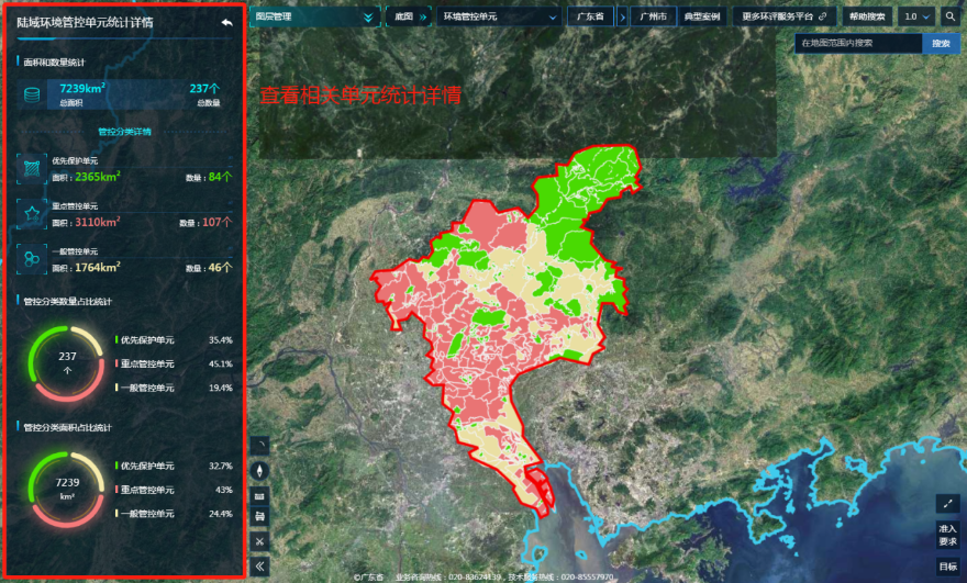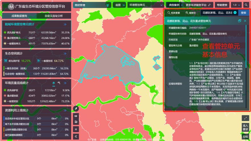 在左侧统计信息栏中,可查看环境管控单元、各要素管控分区的数量、面积及其占比等统计信息,点击详情按钮可进一步查看统计详情。