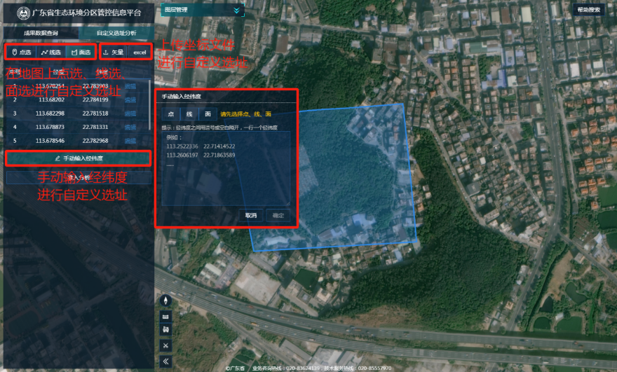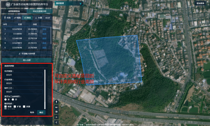 通过在地图上点选、线选、面选,或者上传坐标文件,或者手动输入经纬度等方式输入空间位置信息,选择环评类别或者行业类别进行模拟项目选址,识别选址涉及的环境管控单元,分析与相关管控要求的符合性,为项目选址可行性提供参考。