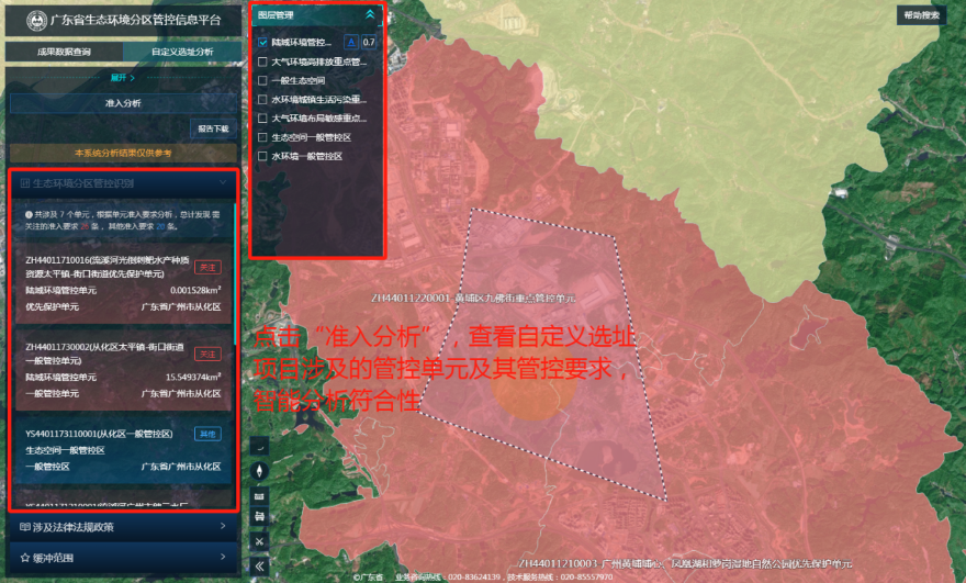 通过“广东省生态环境分区管控信息平台”网页端查询,查询相关规划和建设项目所涉及的环境管控单元的编码、名称和管控要求等信息,并可通过导入空间位置信息,预判选址与生态环境分区管控的符合性。