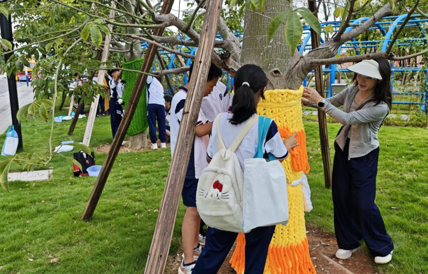 在“大树穿衣”环节,20余名学生与村居民代表利用回收毛线等材料,为大井村主干道两侧的树木“编织彩衣”。经过学生们的巧手装扮,树干变成一道道色彩斑斓的“绿色艺术装置”,生动诠释了“变废为宝、创意再生”的绿色低碳无废理念。