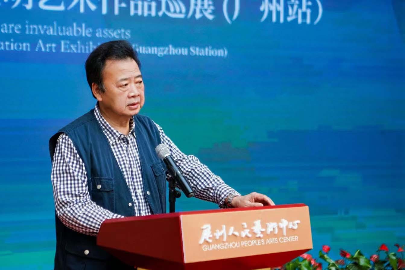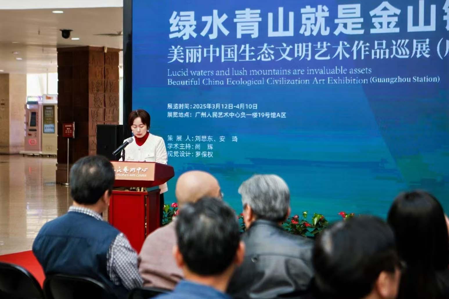 项目负责人、策展人安琦介绍了展览的基本情况并宣读了中国民主促进会广东省委员会主委、原广东省生态环境厅厅长鲁修录的贺词: “广州站巡展的启幕既是民进会员与广大文艺工作者赓续出新的生动实践,更是以文化赋能生态文明建设,助力绿美广东生态建设的创新之举。多年来,广东民进始终心怀国之大者,充分发挥文化教育主界别的优势,团队引领广大会员及文艺界人士,以笔墨为媒,以艺术为桥,积极传播绿色发展,厚植生态文明根基。此次巡展的深化与拓展,不仅展现了民进人服务大局的使命担当,更彰显了新时代艺术工作者扎根人民,讴歌时代的家国情怀。”