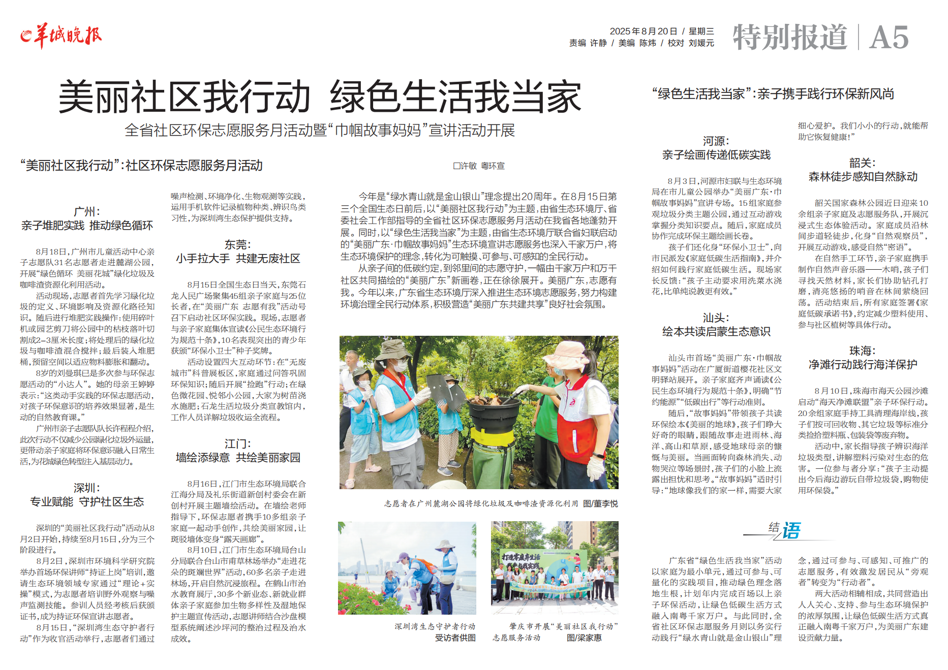 今年是“绿水青山就是金山银山”理念提出20周年。在8月15日第三个全国生态日前后,以“美丽社区我行动”为主题,由省生态环境厅、省委社会工作部指导的全省社区环保志愿服务月活动在我省各地蓬勃开展。同时,以“绿色生活我当家”为主题,由省生态环境厅联合省妇联启动的“美丽广东·巾帼故事妈妈”生态环境宣讲志愿服务也深入千家万户,将生态环境保护的理念,转化为可触摸、可参与、可感知的全民行动。