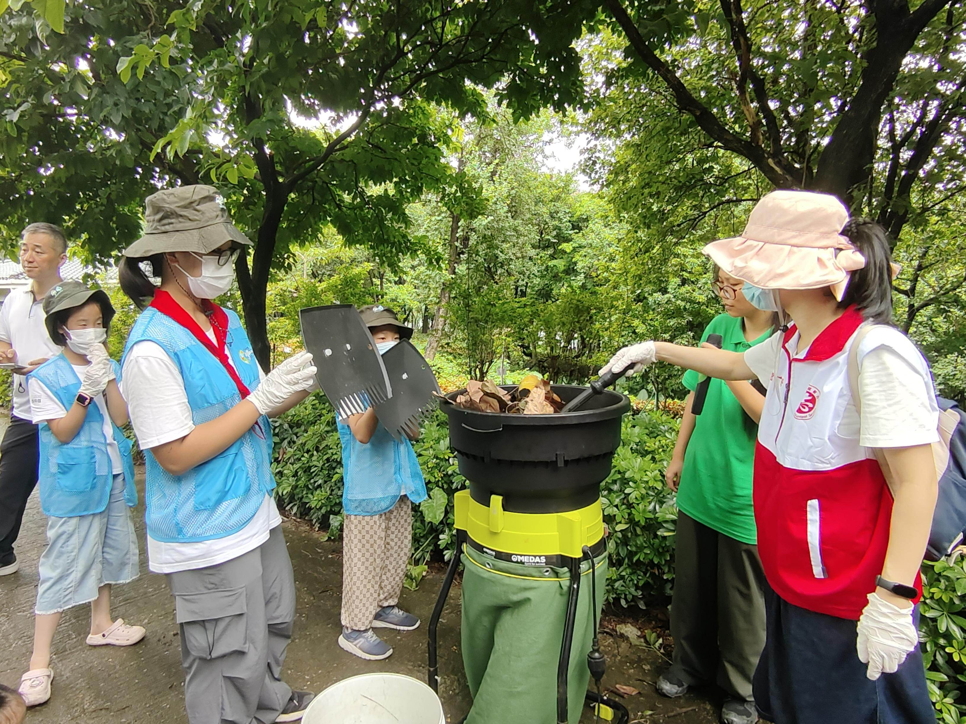 活动现场,志愿者首先学习绿化垃圾的定义、环境影响及资源化路径知识。随后进行堆肥实践操作:使用碎叶机或园艺剪刀将公园中的枯枝落叶切割成2-3厘米长度;将处理后的绿化垃圾与咖啡渣混合搅拌;最后装入堆肥桶,预留空间以适应物料膨胀和翻动。