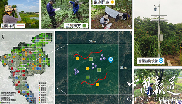 在此网络体系下,共选定80个监测样区开展调查,其中包括30个重点监测样区和50个普通监测样区。每个监测样区设置有动植物样线(鸟类、两栖类、爬行类、昆虫、植物群丛)、植物样方、昆虫与小型哺乳类样点,同时还布设智慧监测设备开展持续生物多样性监测。