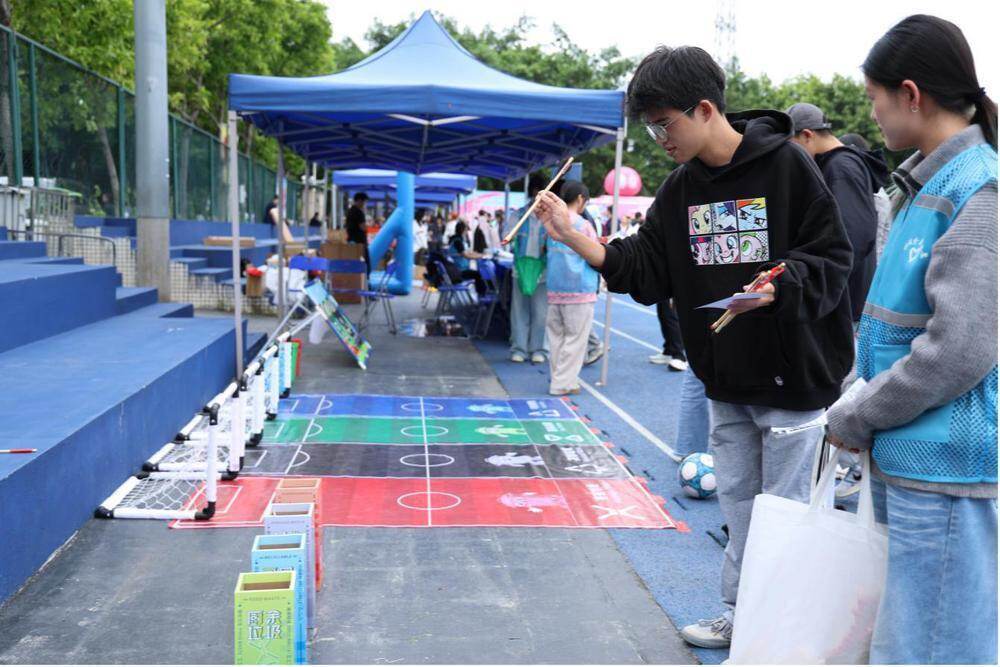 宣传点位设置了 “分类投沙包”“乒乓速分台”“绿茵分投战”“投分类壶”等一系列寓教于乐的互动游戏,吸引众多学生积极参与。
