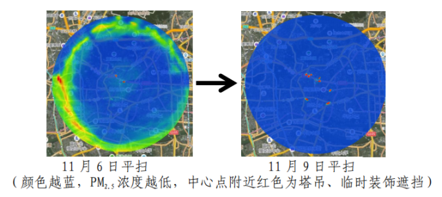在11月7日—9日保障期间,通过每小时发布激光雷达平扫结果,精准发现4处颗粒物热点区域,实现即扫、即查、即改,以工地、道路周边PM2.5小时监测浓度作为检验扬尘治理成效的依据,每小时督导整改反馈情况,努力做到“异常点位只出现一小时”,让治理决策有数据支撑、有方向可循、有手段可治。