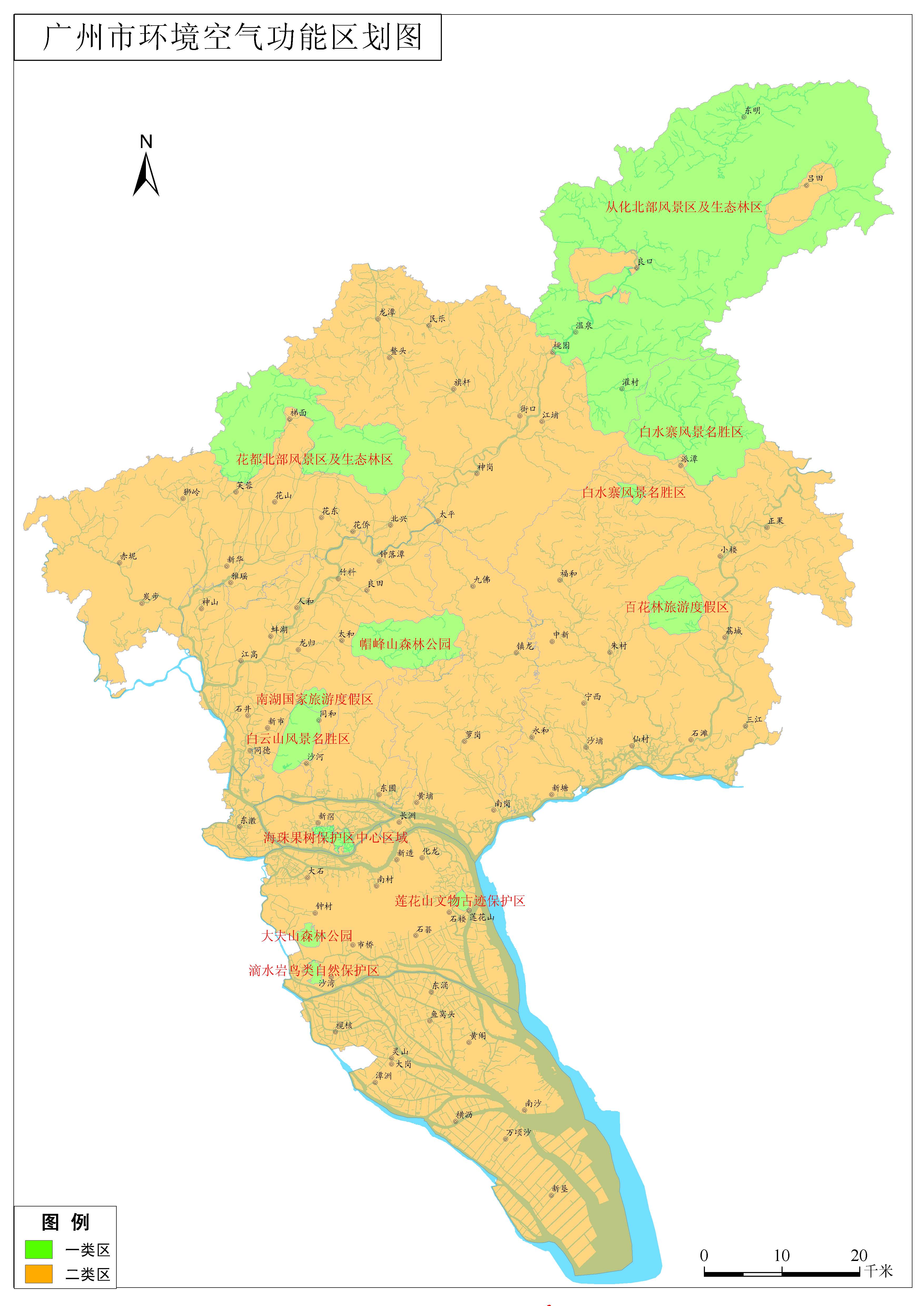 广州市环境空气功能区划分的范围是广州市行政区域范围,包括10区2市(县级),分别为越秀区、海珠区、荔湾区、天河区、白云区、黄埔区、花都区、番禺区、南沙区、萝岗区、从化区和增城区。总面积7434.4平方千米。