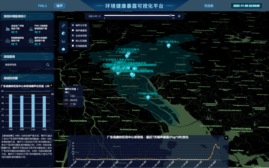 广东省广州生态环境监测中心站(简称“广州监测站”)联合中山大学地理科学与规划学院,开展了一场关于赛事期间人群健康与PM2.5、噪声、热指数相关性的深度研究。