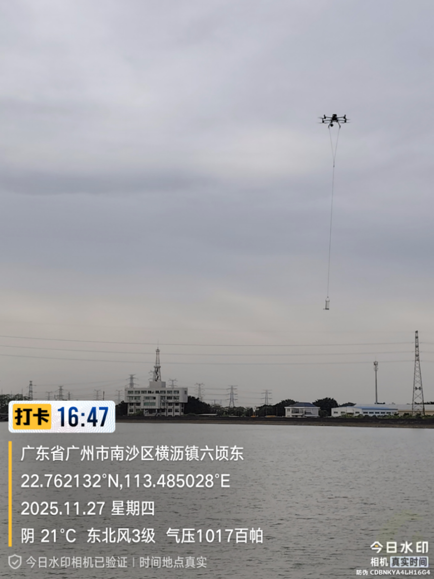 针对偏远水域、地形复杂区域采样不便等问题,南沙引入无人机水质采样系统。搭载定制采样设备的无人机,可在技术人员遥控下精准抵达指定坐标,完成定深、定量自动采样及快速送回任务,彻底摆脱对船只和通行道路的依赖,有效破解传统手工采样中偏远河涌、浅滩水域、狭窄河道难以抵达的困境,显著提升采样灵活性和人员安全性。